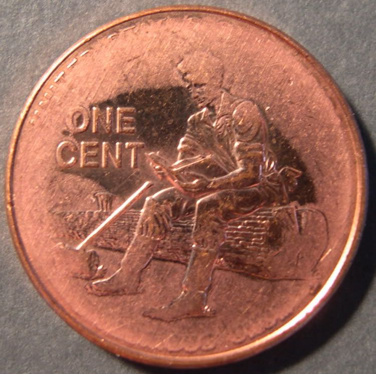 The obverse is normal. The inside of the reverse is also normal. I'll take a better picture and post it later. All the grease filled strikes I've found in the past were a little lighter than normal on the details. This one obliterated the words almost completely. |