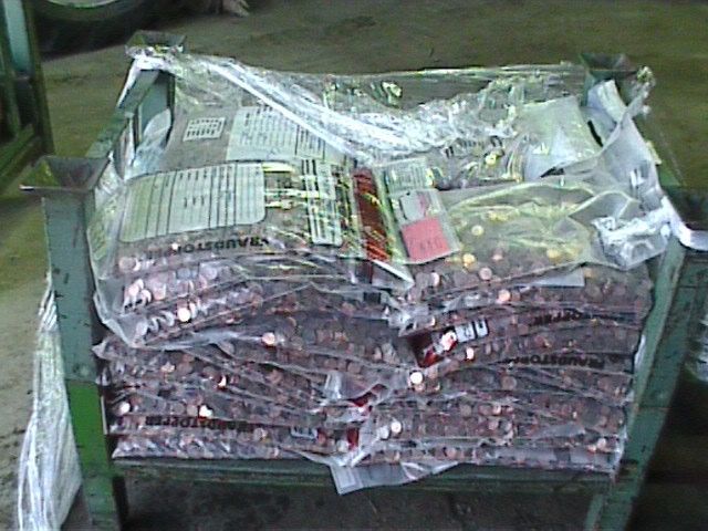 I noticed the big tire behind the pennies. You appear to almost be a commercial operation. One question, are the zincs dumped the same way that the mixed bags arrive? You know, are you able to just swap out your own pallet of zincs for a mixed pallet? Thanks for the great pictures you have been posting. We love pictures....