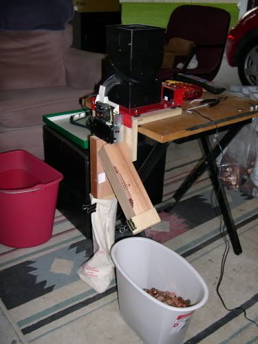 Thanks Andy - I put that thing together out of plywood and a cigar box. It sits on the edge of the table and I put the Ryedale on top of it. I clamp bags onto the chutes or let the pennies fly into an open bucket. It makes things a little louder but that means I can hear it if it jams from long distance.