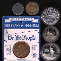 Clockwise from top left: * 1979 Italy 100 lira * JFK private commemorative brass token * Pearl Harbor commemorative 1oz silver round, 2003 from the Honolulu Mint * 1986-S clad proof Statue of Liberty half dollar * 1986-S silver proof Statue of Liberty dollar * 1987 US Constitution bicentennial bronze medal