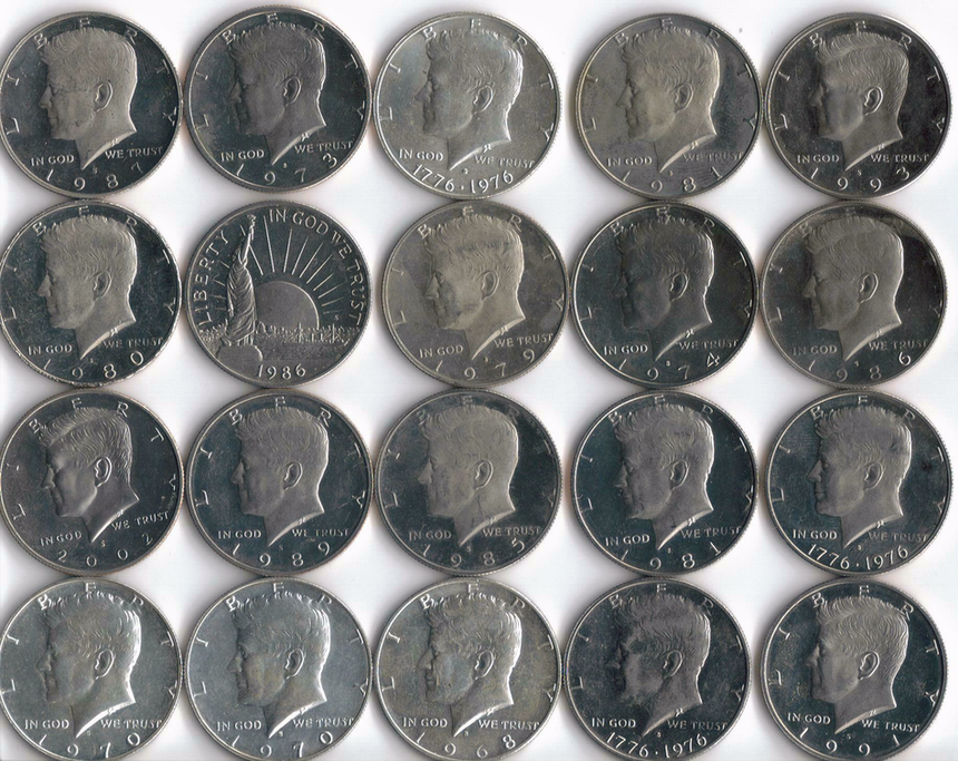 Hey country, thanks for the tip, but none of the dimes are silver. I would have spotted the silver because I edge sort all dimes. I used to worry that I might miss a proof by edge sorting but the reeds on a proof are better looking than reeds on non-proofs. Ant, To be fair, I have posted some of these before. I like posting these pics, lol. Here are some proof of halves I have found. I think one of the 1976 proofs is 90% or 40% silver. I live in southeast alabama.